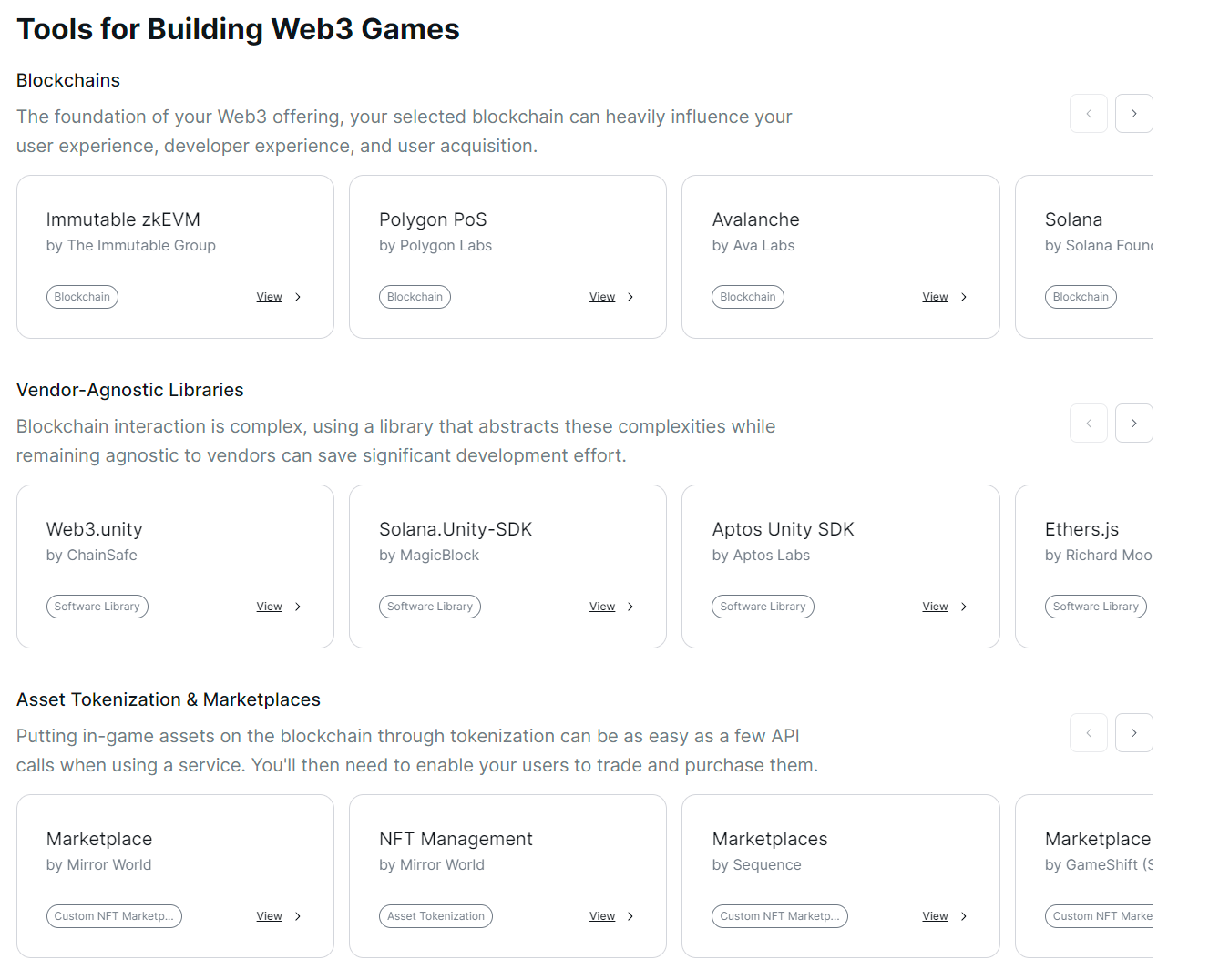 The Builder’s Guide is organized primarily by common web3 project types and the solutions and critical layers that support them. Click through to the solution type that aligns with your project or scroll to the bottom to search for a specific toolset in mind. Each solution page lays out basic definitions and parameters to keep in mind, then suggests all of the tools and providers you need to bring the solution to life.